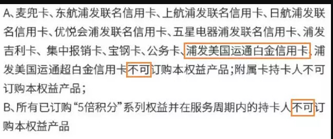 浦发美国运通白金(超白)信用卡不可订购本权益产品,航空/酒店联名卡不可订购该产品。在细则中同时还说了,若持卡人订购了本权益产品后再申请AE白(超白),从核卡之日起便无法享受5倍积分权益!如权益已生效,核卡成功次日起不再享受5倍积分,已生效服务权益费用不再退回,同时权益不再续约!